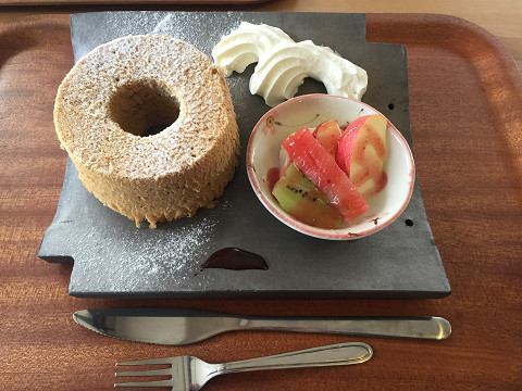 2017/11/10 - mariyoko233さんの株式ブログ。タイトル:「ケーキ」 本文:瓦の器の上にシフォンケーキとフルーツが乗ってます