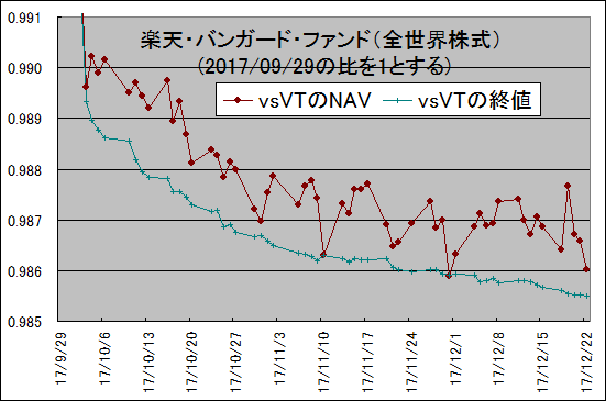 2017/12/23 - miyakenさんの株式ブログ。タイトル:「楽天・バンガード・ファンド(全世界株式)」 本文:VTに投資する楽天・バンガード・ファンド(全世界株式)の基準価額とVTの価格を比較してみました。2017/12/22までの・ファンド価格とVT価格(NAV・終値)の比の推移・ファンド価格の騰落率と、V