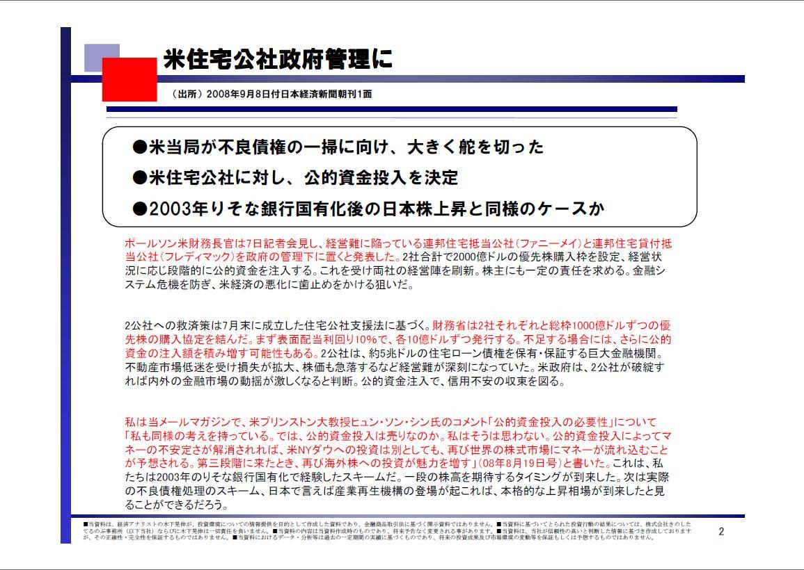 2008/09/08 - 木下 晃伸さんの株式ブログ。タイトル:「【投資脳のつくり方】米住宅公社政府管理に」 本文:みなさま、いかがお過ごしでしょうか。 経済アナリスト、木下 晃伸(きのした てるのぶ)です。 ●日本の歴史 日本の金融不安から解消に向かった歴史を学ぶことで、