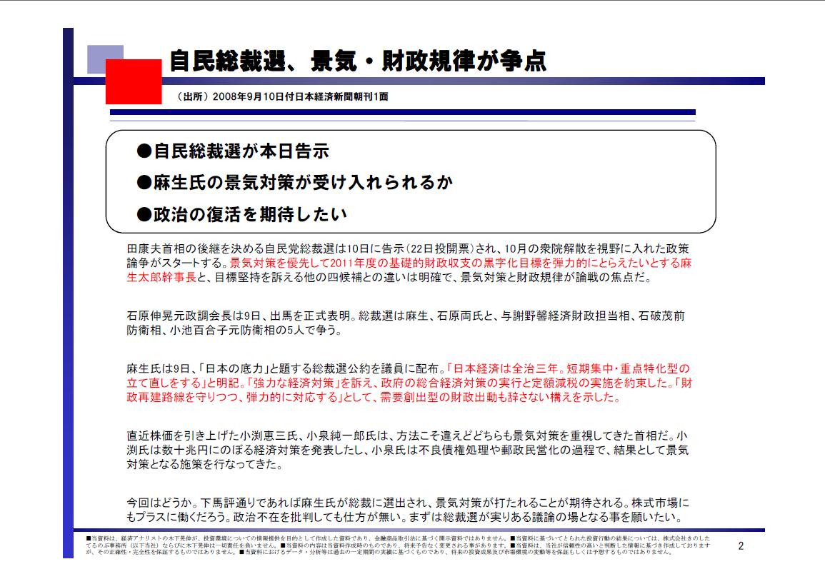 麻生氏は9日、「日本の底力」と題する総裁選公約を議員に配布。