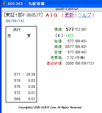 2008/09/16 - miyakenさんの株式ブログ。タイトル:「本日の東証でのAIG株」 本文:みなさん強気だったんですねえ。。。 今、2.41ドルですが