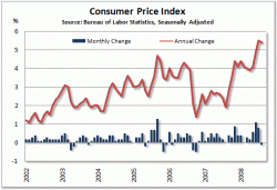 変動の大きいエネルギーと食品を除いたコア指数は前月比0.2%の上昇。全体、コアともに市場予測通りの結果となった。金融不安と雇用情勢悪化が加速する一方で、インフレ圧力はやや緩和した格好だ。米連邦準備理事会(FRB)の金融政策の動向にも影響を与えそうだ。