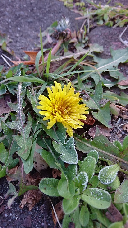 2019/01/03 - TAROSSAさんの株式ブログ。タイトル:「寒い中元旦でも咲いていた花② ~タンポポ~」 本文:昨日に続いての第2弾です。これも元旦の朝、ちょっと外に出た時に見つけた花です。写真のとおり霜がおりている中でもしっかり花を咲かせていました。寒いためか、茎はほとんど伸びていなくて、地面にピッタリ張り付