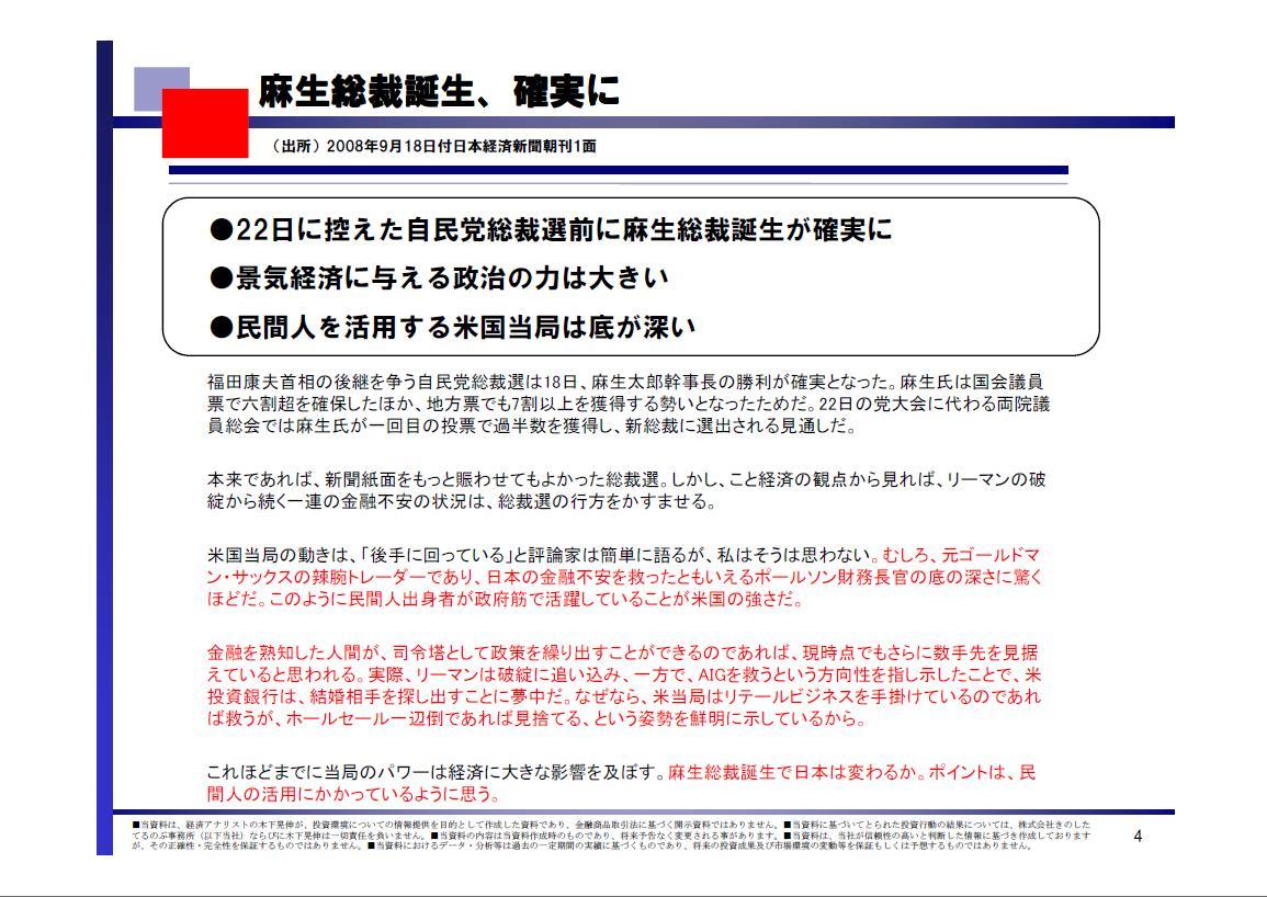 リーマンの破綻から続く一連の金融不安の状況は、総裁選の行方をかすませる。