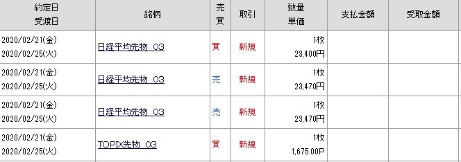 2020/02/21 - verifyさんの株式ブログ。タイトル:「2/21 寄り付き」 本文:本日の建玉です225先物 寄付き 売り2枚 Topix先物 寄付き 買い1枚225先物 23400 買い1枚225先物 売り差し 2枚