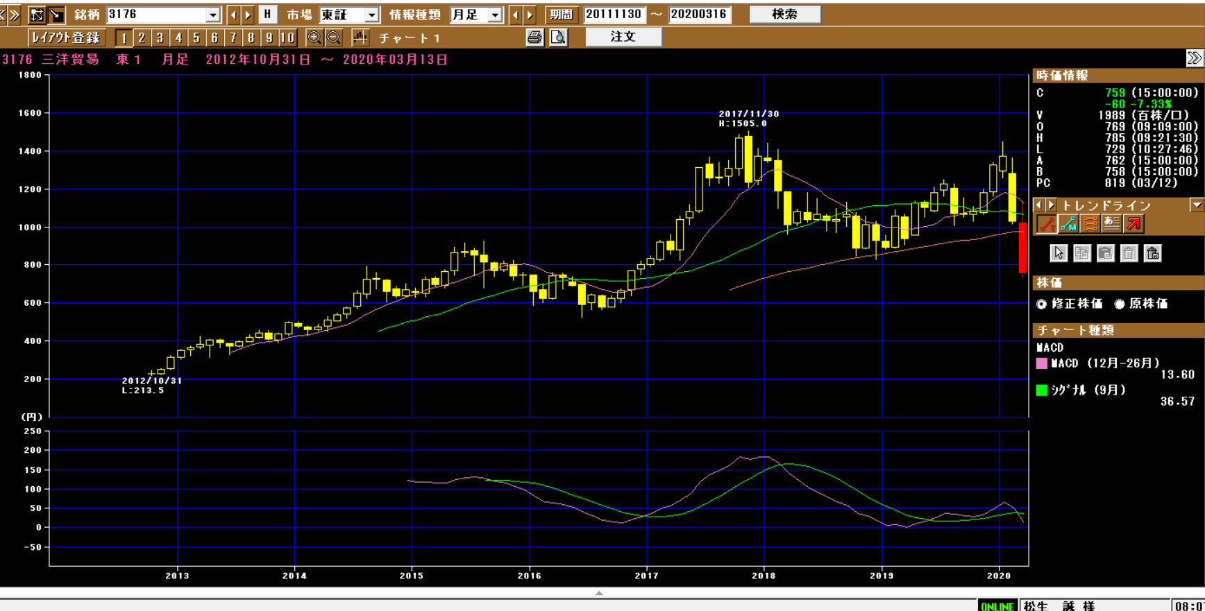 2020/03/15 - ikechandesuさんの株式ブログ。タイトル:「あるカラ売り銘柄の下値のメドを考えてみると・・・。」 本文:現在16銘柄トレードしてますが、全て空売りで、利益が出るたび利確して、取引株数を増やしながらトレードしてます。そろそろ、株数増やすのは、リスクが・・・。月足・週足チャートで私なりに下値を探ってみます。