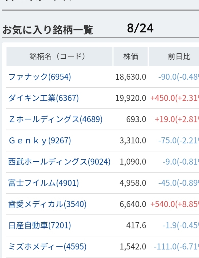 2020/08/24 - アンドレアグリーンさんの株式ブログ。タイトル:「8/24 ダイキン上がってるやん!」 本文:ファナック下がりすぎ~ダイキン上がってるやん!旦那はん判断ちがっとるやん!でもシーアイメディカルさん10日で2000円も上がってる!いつ売ればいいんやろう。間違えないようにしよう!