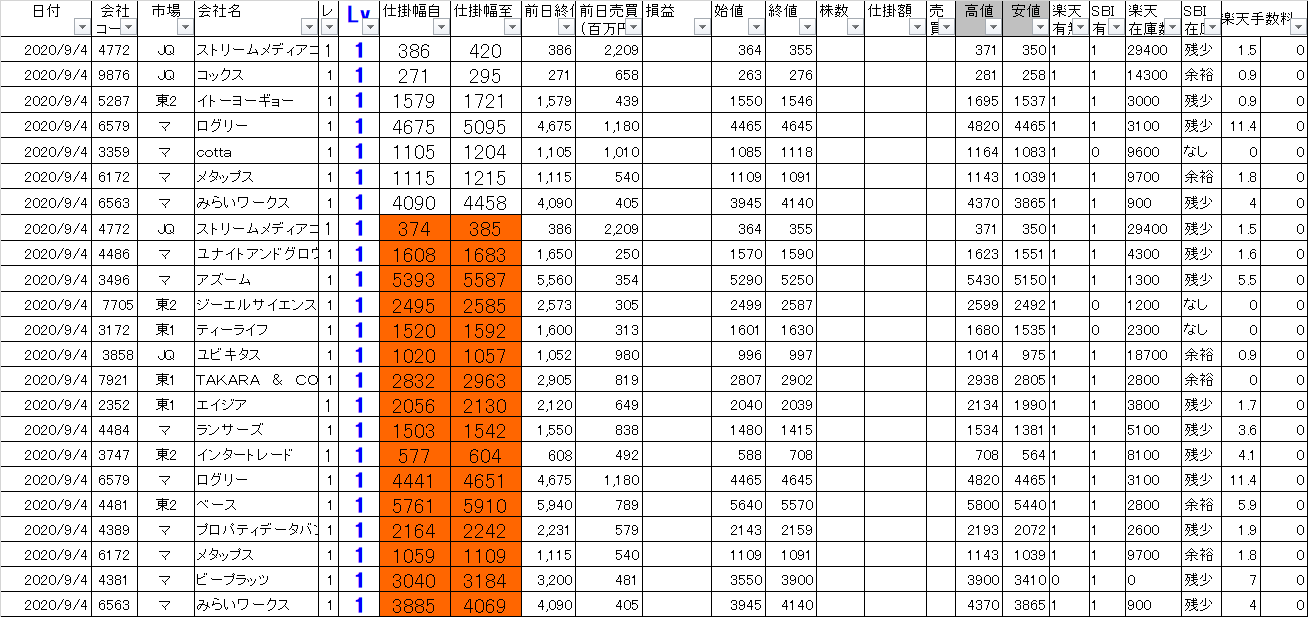 ※仕掛け表中の背景色がオレンジの行は【買い仕掛け】の対象銘柄で、データ収集のためのものです。(仕掛表について詳しくはこちらを)