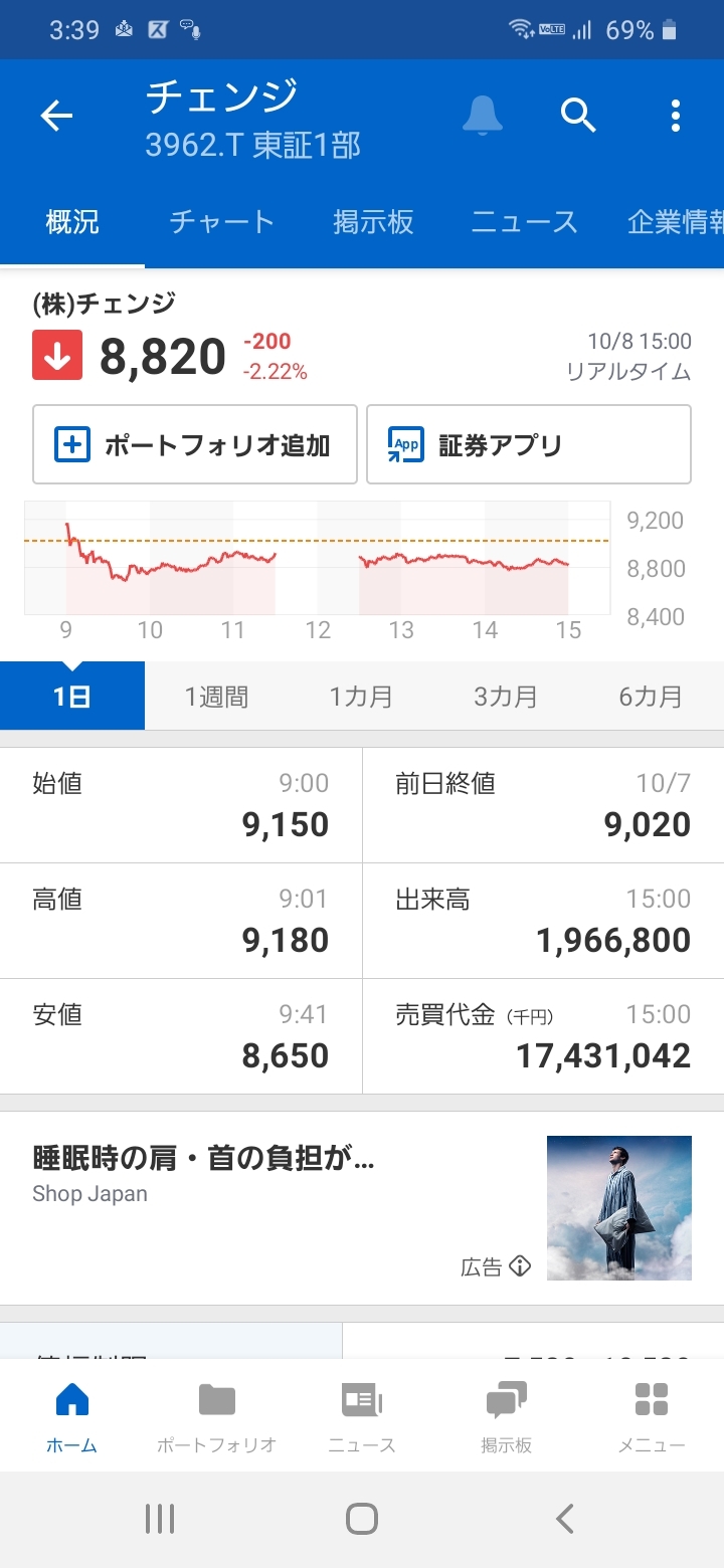 2020/10/08 - アンドレアグリーンさんの株式ブログ。タイトル:「10/8 チェンジ欲しかったなぁ」 本文:明日は買うぞぅ!