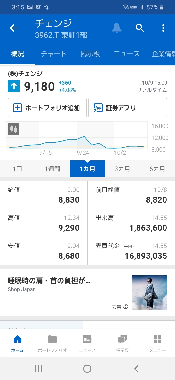 2020/10/09 - アンドレアグリーンさんの株式ブログ。タイトル:「チェンジさんはデイトレいいよね。」 本文:今日も800円の上下。。。遊びたいけど危険かなぁ
