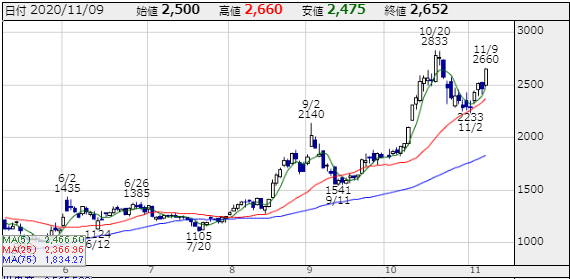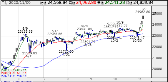 先週末でバイデン元副大統領が大統領当確がましたが…、週明け相場は予想を遥かに超える強い買いが続いて、日経平均株価終値24,839.84円、前日比+514.61円!