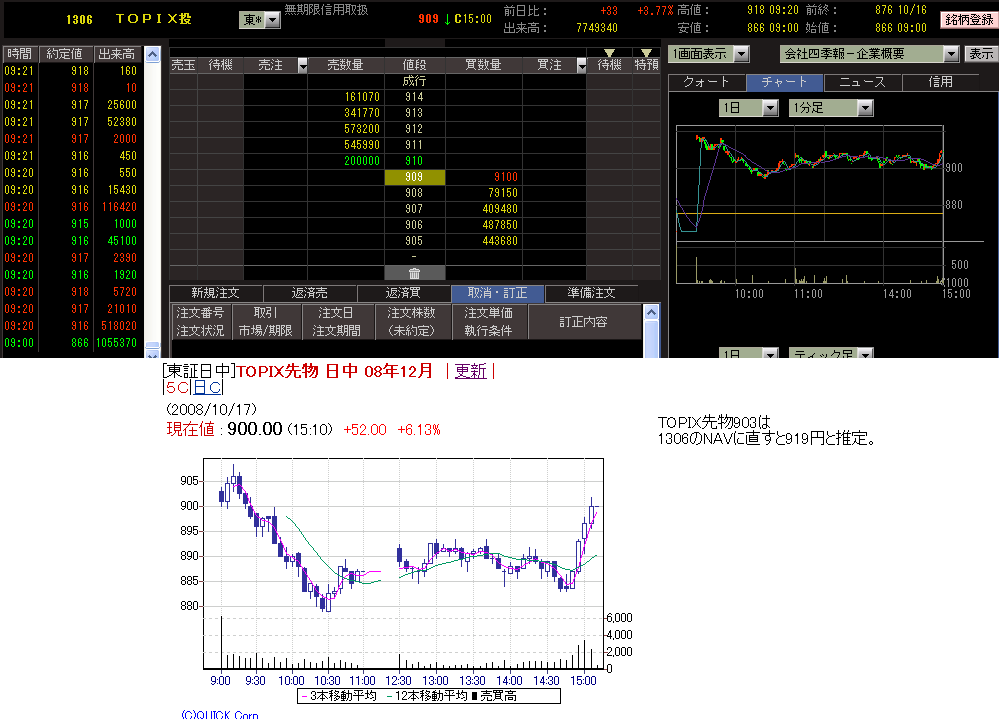 2008/10/17 - miyakenさんの株式ブログ。タイトル:「野村TOPIX-ETF(1306)の寄り付き」 本文:今日の野村TOPIX-ETF(1306)は寄付が安く、すぐに買い気配となりました。 TOPIX先物の始値は9:02に903.00。9:20は902.50。