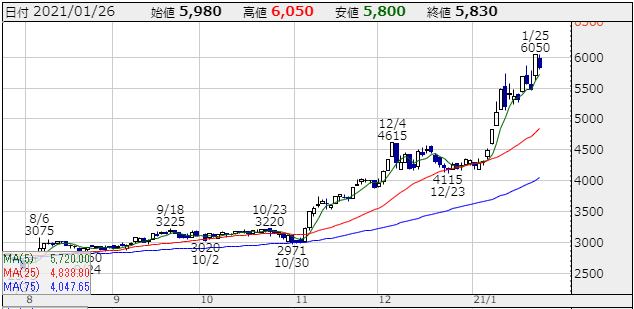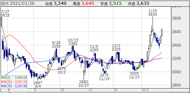 結構出遅れていた銘柄ですし、1月27日に決算がありますが普通に考えれば業績いいと思うんですけどね!高値抜ければ勢いつけて4000円まで上昇していきそうですからね!