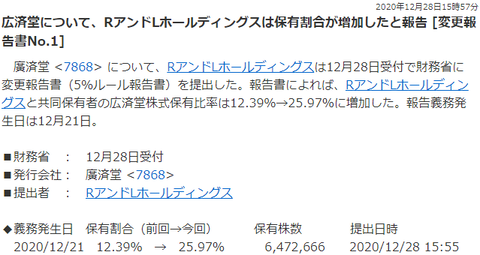 同社の筆頭株主は、あの麻生太郎財務相の麻生グループが20%保有しているのですが、12月28日に大量報告をR&Lホールディングスが出しているのですが、広済堂株式保有比率は12.39%→25.97%に増加しているんですよね!