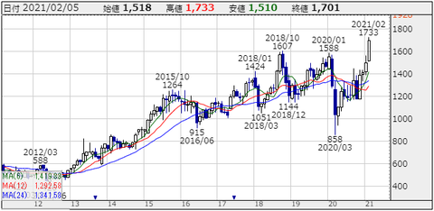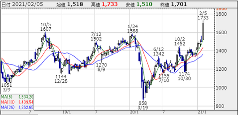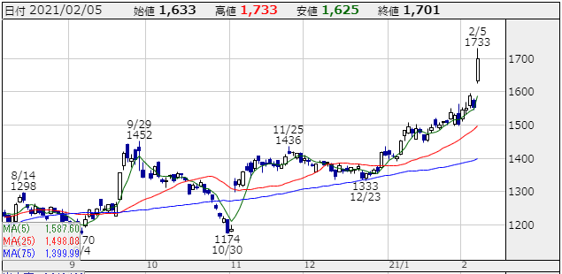 週足、月足チャートをみても今まで高値のどうしても突破できなかった1600円をしっかりと抜けて1700円を超えて取引終了していますからね!これは青天井チャートと言っても過言ではないでしょう!