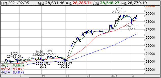 前も2万7000円近辺で長いもみ合いから上に飛び出して、2万8979.53円まで上昇してそのラインまできています。日経平均株価は終値2万8779.19円ですので、221円の上昇で2万9000円ですよ!
