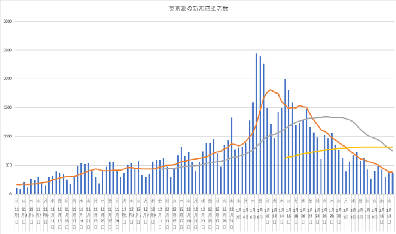 西村大臣は新規感染の減少が鈍くなっているようにおっしゃったようだが、日々の実データと7日移動平均線は、まるで株価のように微妙に接している。これは上値抵抗線に抑えられた