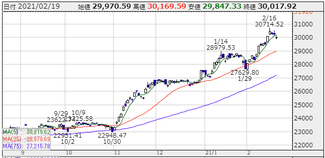 まあ急ピッチな上げでしたし、引けにかけては下げ渋って3万円維持したわけなので、ここからが期待の相場とは思っていますが、「2月16日の高値30,714.52円から今日の安値の水準だと1000円近い下げからね。」