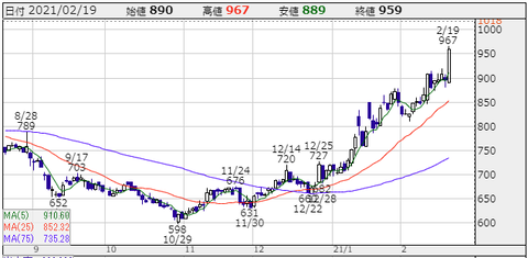 寄り付き890円から高値で967円まで上昇していますが、チャートが高い位置からもう一段高!!