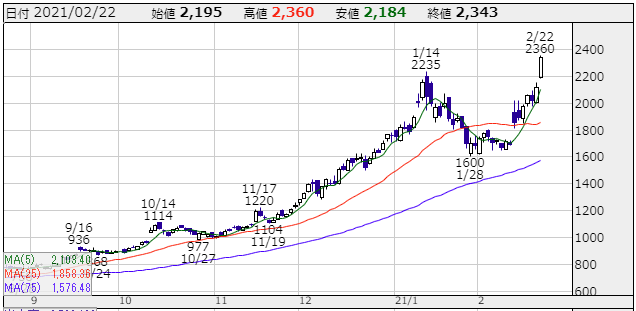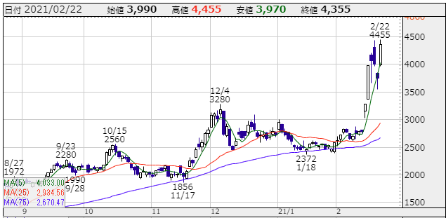 半導体ウエハや半導体設備向け部品を製造。真空シール世界シェア6割の企業です。直近の決算も4-12月期(3Q累計)経常が65%増益で着地・10-12月期も2.9倍増益と業績面も抜群なのですが、本日、「中国で半導体製造プロセス用の治具消耗材のシリコンパーツを増産する方針を固めた」とのニュースがでてから急伸!