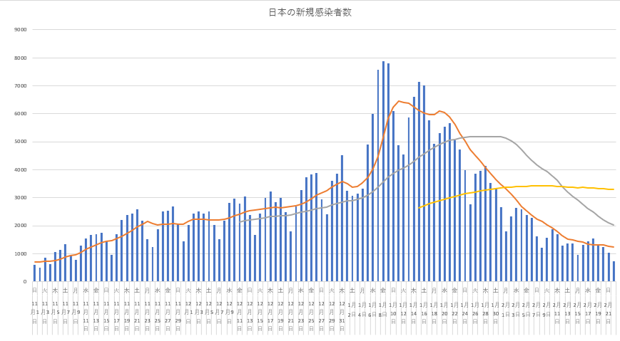 まずは東京都のデータから。日本データの本日分は明日更新予定です。グラフには昨年の11月1日分から表示させていますが、そのころに近くなってきたでしょうか。土日月の下げカーブはいつも急なので、明日からまた様子見ですね。月末までに3月の判断をできるでしょうか。