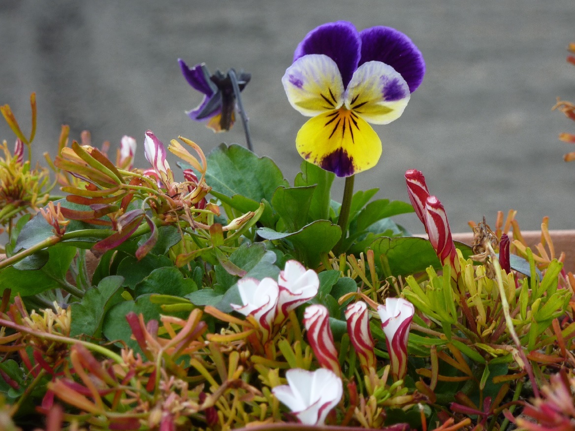 2021/02/28 - 小督さんの株式ブログ。タイトル:「草木萌動(そうもくめばえいずる)」 本文:「オキザリス」群の中に咲く「ビオラ」と 何を植えたか思い出せない緑の一群