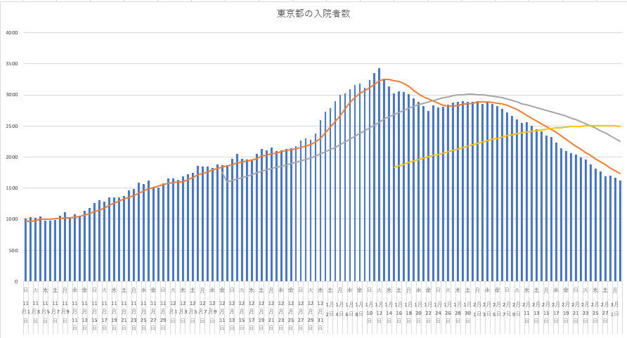 2021/03/03 - りす栗さんの株式ブログ。タイトル:「3月3日(水) 感染データグラフ」 本文:まずは東京都の新規感染と入院患者数の推移。新規はこれまでも想定されたように、ほぼヨコヨコのため、近々に7日移動平均線が28日移動平均線に接近遭遇しそう。株価じゃないので、そう簡単にはゴールデンクロスと