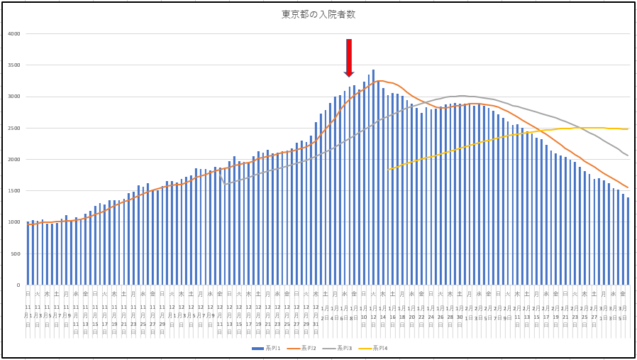 2021/03/06 - りす栗さんの株式ブログ。タイトル:「3月6日(土) 感染データ」 本文:※皆さんのコメント見てるうちに、1月7日ってどうだっけ?と思って、グラフに赤い矢印を書き込み、入れ替えました。まずは東京だけ。新規感染は完全にヨコヨコ。これはしばらく仕方ないとして、入院患者がどんどん