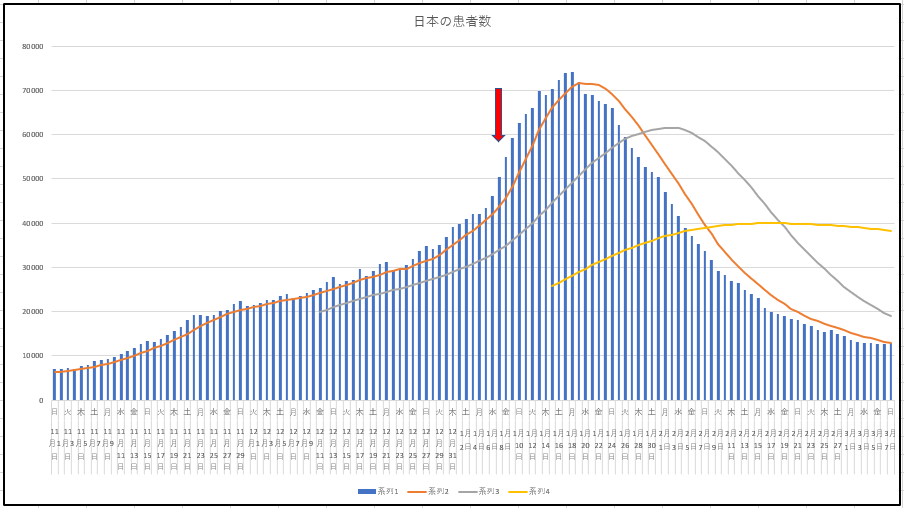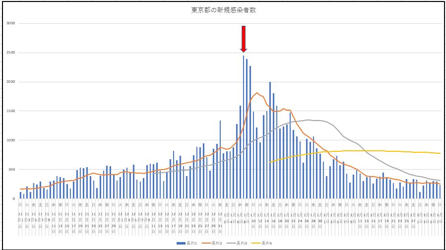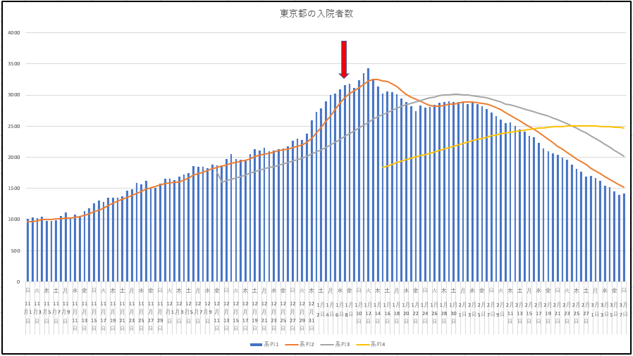 データは、いつものように東京都の新規感染と入院患者数の推移のグラフから。