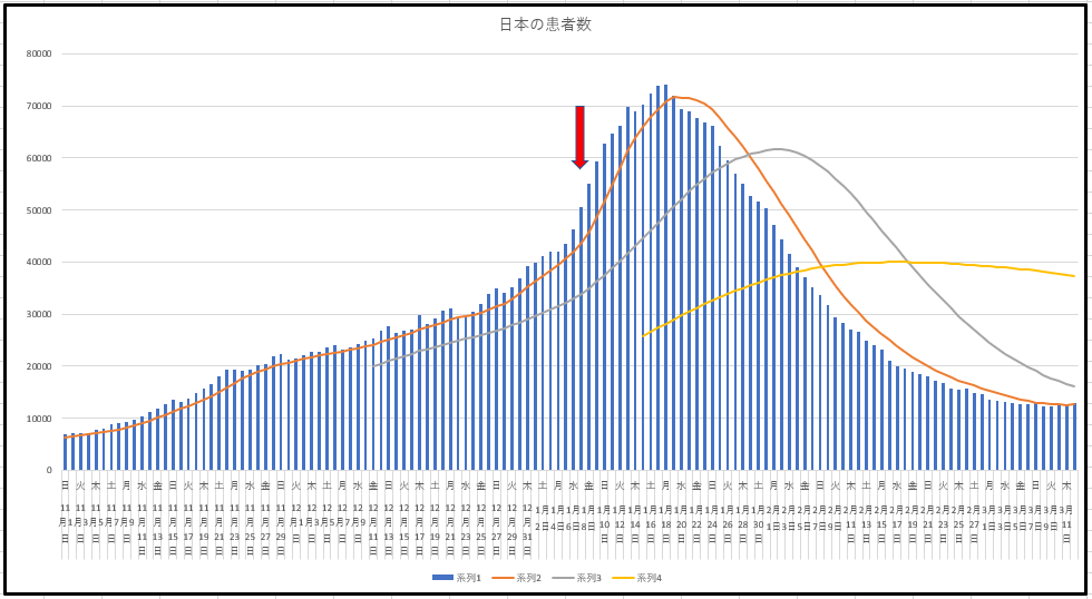 東京都の新規感染と入院者数の推移。新規感染は昨年の11月初旬レベル。入院者数は鋭意減速中だが、そのレベルにはもうあとちょっと。