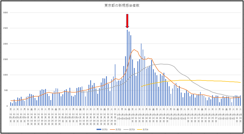 東京の新規感染と入院患者数の推移。東京のデータは毎日朝の9時に締め切って諸々を集計し午後3時に発表される。つまり今日発表のデータは実質昨日の実績なのだ。今日のだけ見ると完全にゴールデンクロスで上昇に転じる風だが、本来少ないはずの日月がどうなるか、ですね。