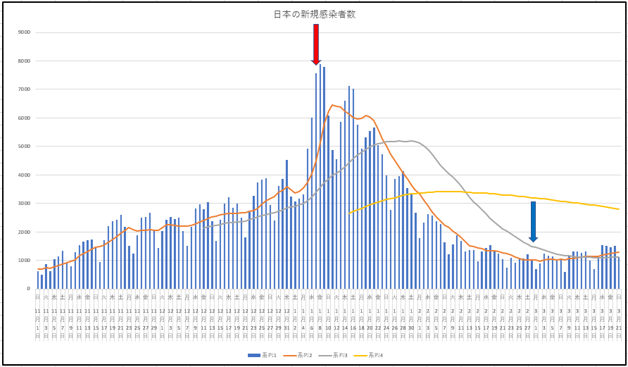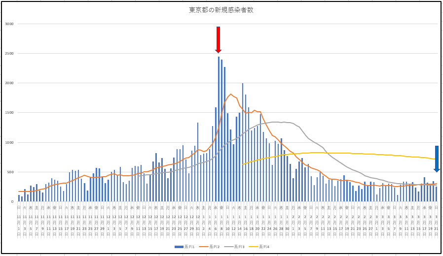 2021/03/22 - りす栗さんの株式ブログ。タイトル:「3月21日(日) の感染データは掲載順変更」 本文:東京都も緊急事態宣言解除になりましたので、青い矢印を入れました。今日からは、東京都と日本の新規感染を並べます。縦軸の数字は異なります。