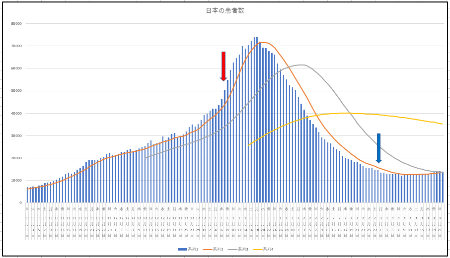 東京都の新規感染と入院患者数。青い矢印がまさに解除の位置。月曜に新規が少ないのは普通ですが、平均線の動きは微妙ですね。それに入院患者って微増している風。