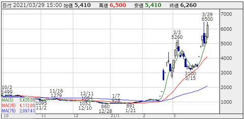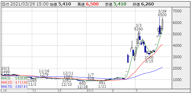 2月12日初値1130円の株価はあれよあれよという間に、「1ヶ月半で株価6500円!株価5.7倍!」