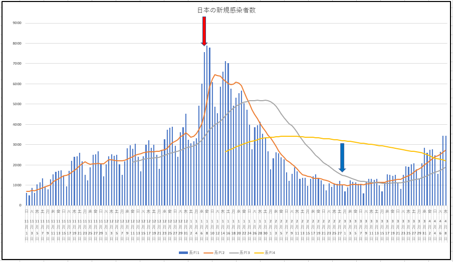 東京と日本の新規。大阪の新規感染はグラフにしてないけど日本全体の内の4分1以上継続中なので日本の傾向は今や大阪(関西)の傾向とみてもよさそう。でも、ご心配なく。東京もすぐ追いつきますよってに(**)b