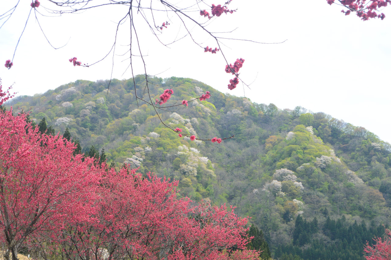 山々の山桜は満開で、遠くの山の峰には雪が。。。