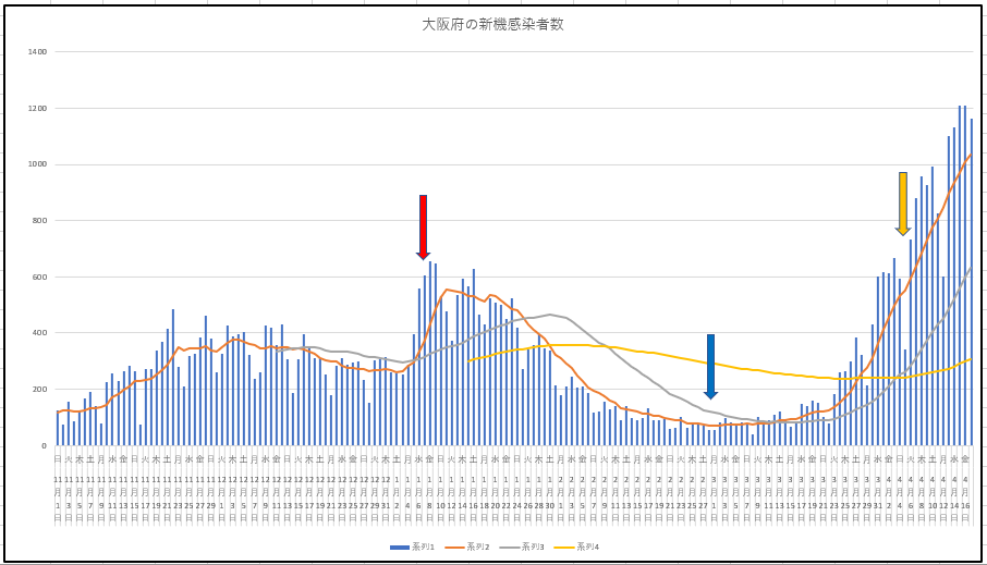 2021/04/18 - りす栗さんの株式ブログ。タイトル:「4月17日までの大阪の感染データ」 本文:大阪のことを騒いでいても本当のところを知りたいので、大阪府の新規感染者数のデータを入手して、グラフ化してみました。これまでのように、7日、28日、84日移動平均線を入れました。図の左端は昨年の11月1
