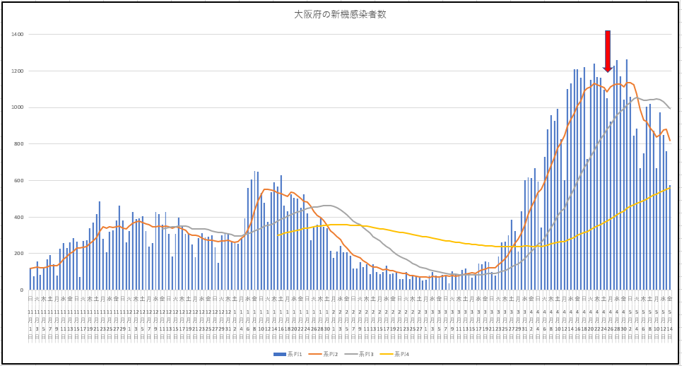 2021/05/14 - りす栗さんの株式ブログ。タイトル:「5月14日(金)感染の魔の手は田舎に?」 本文:東京都と大阪府の新規感染の推移。1月の正月休み明けの東京都がとんでもないところから落ち着いていったように、GW明けの大阪もなんとかなってきたかな。北海道の緊急事態を当初政府が認めなかったのは、GW中の