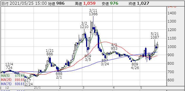 800円後半から好材料で5月21日にはSTOP高!株価1087円まで上昇しましたが、その後は値を下げて1000円を再び割り込みましたが、中国当局が「承認」という事となれば、吹っ飛びそうな感じです。