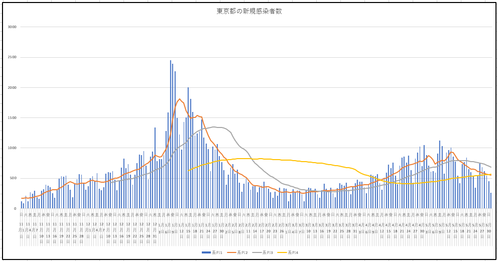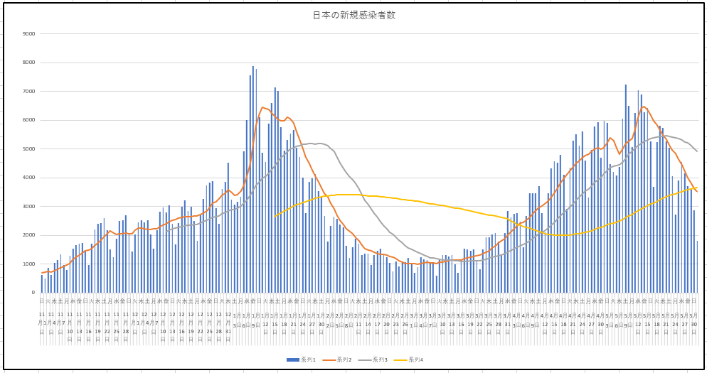 2021/06/01 - りす栗さんの株式ブログ。タイトル:「5月末までの感染データ」 本文:東京都、大阪府、全国の新規患者推移。短期平均線の減少は顕著。全国的には他の地域(北海道、沖縄)がまだ危険水位か。愛知県もやや危ない。