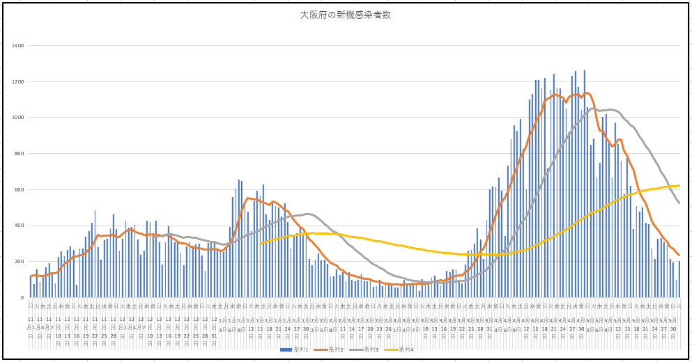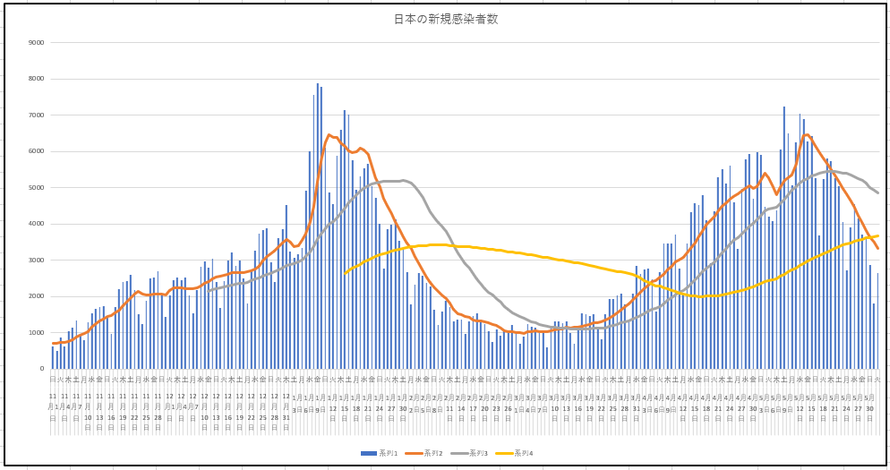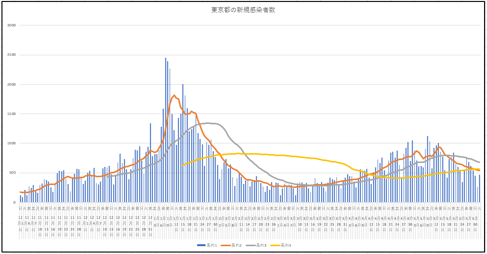 2021/06/02 - りす栗さんの株式ブログ。タイトル:「トレーダーなら誰しも思う」 本文:移動平均線は美しい。6月1日までの新規感染者数の推移。東京都、大阪府、日本。曜日による違いを吸収するために、7日、28日、84日の各移動平均線を描いているが、ちょっと太くしました。デッドクロスしてます