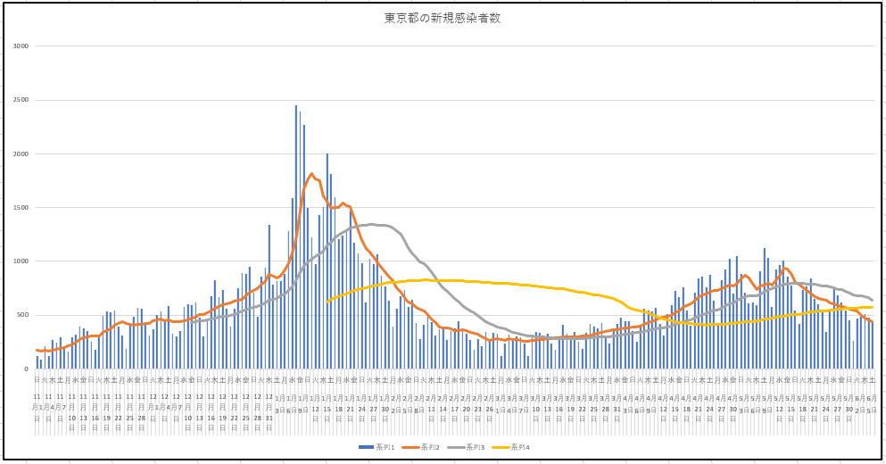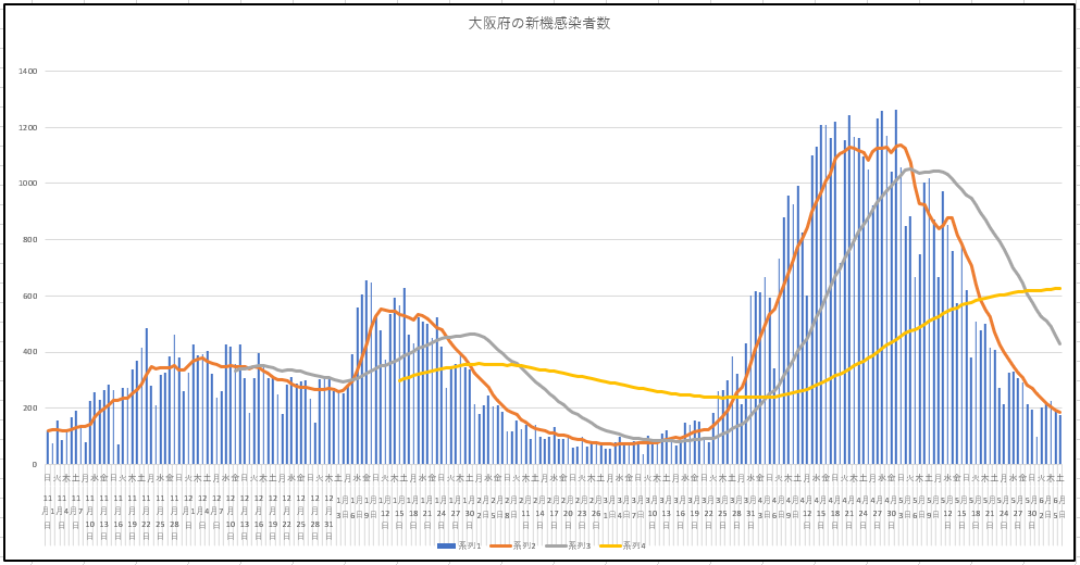 2021/06/05 - りす栗さんの株式ブログ。タイトル:「ワクチン効果が明確になる日が待たれる」 本文:東京都と大阪府の新規感染の推移グラフ。ワクチン効果が出るまでは、人口比である一定以上はどうしても感染者が出続けるということならば、そろそろ底打ちヨコヨコになるでしょうか。来週あたりがポイントかも。