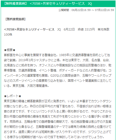 株 株提供 オリンピック関連銘柄 7058 共栄セキュリティー