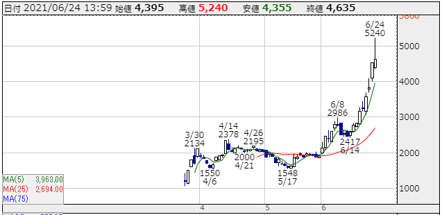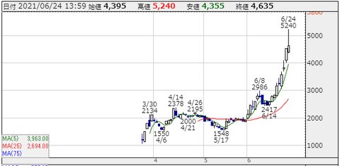 投資家に人気のパワー半導体関連で特殊技術を持っている同社はIPO銘柄という事もあり投資家の人気が火がついて右肩上がりの上昇を続けて、3月24日の上場後初値897円から6月24日には5240円!!