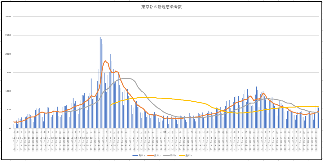 今日はまず東京都の新規感染のみ。このあと近県のデータも発表されると思うが、日本全体がかなり減少してきたのに対して関東が突出している様子が分ることでしょう。