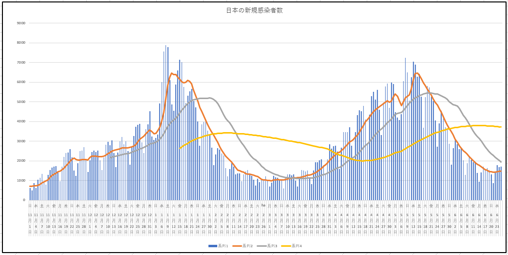日本の新規感染者数の推移。