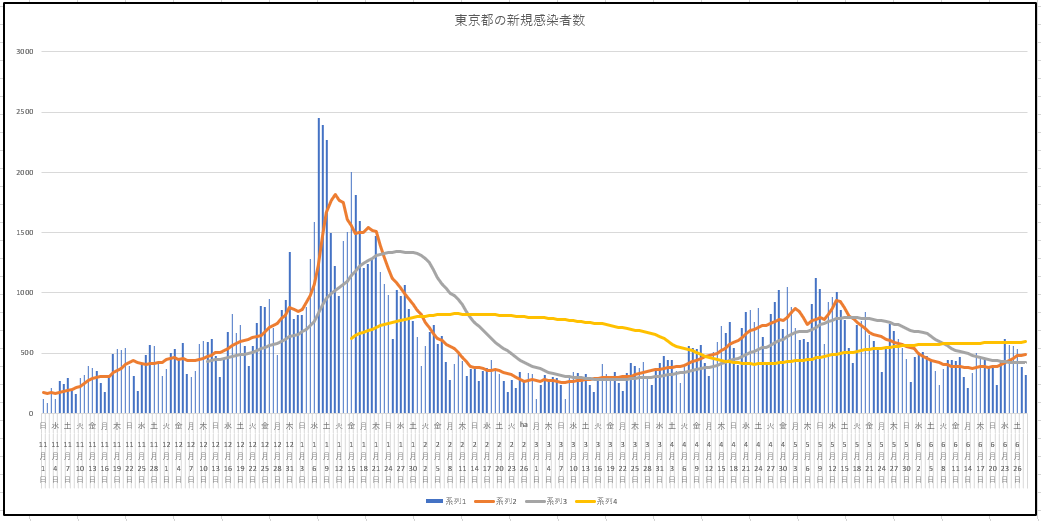 28日(月)までの東京都の感染者数推移。7日移動平均が28日移動平均をGC。