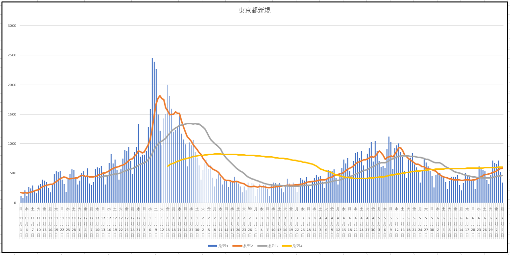 2021/07/05 - りす栗さんの株式ブログ。タイトル:「7月5日(月)東京都の感染」 本文:新規の推移。もう少しで7日移動平均線が84日長期移動平均をGCするところだったのですが踏みとどまりました。いつも報道されているように前週の同じ曜日より上回ったのですが、その幅が小さかったのですね。頭打