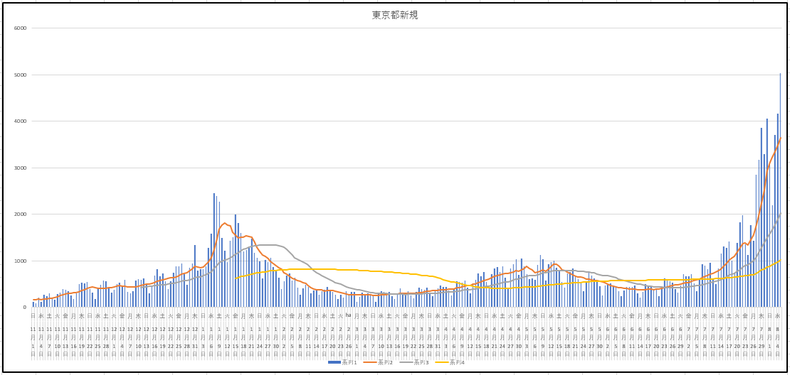 2021/08/05 - りす栗さんの株式ブログ。タイトル:「よろしくないと思います」 本文:東京都の新規感染推移グラフを載せます。無症状や軽症が増えているからといっても、これがある程度の数になると、一定程度の悪化も起きるし、多いことによる処置側の対応ミスなども起きると思います。数のこともそう