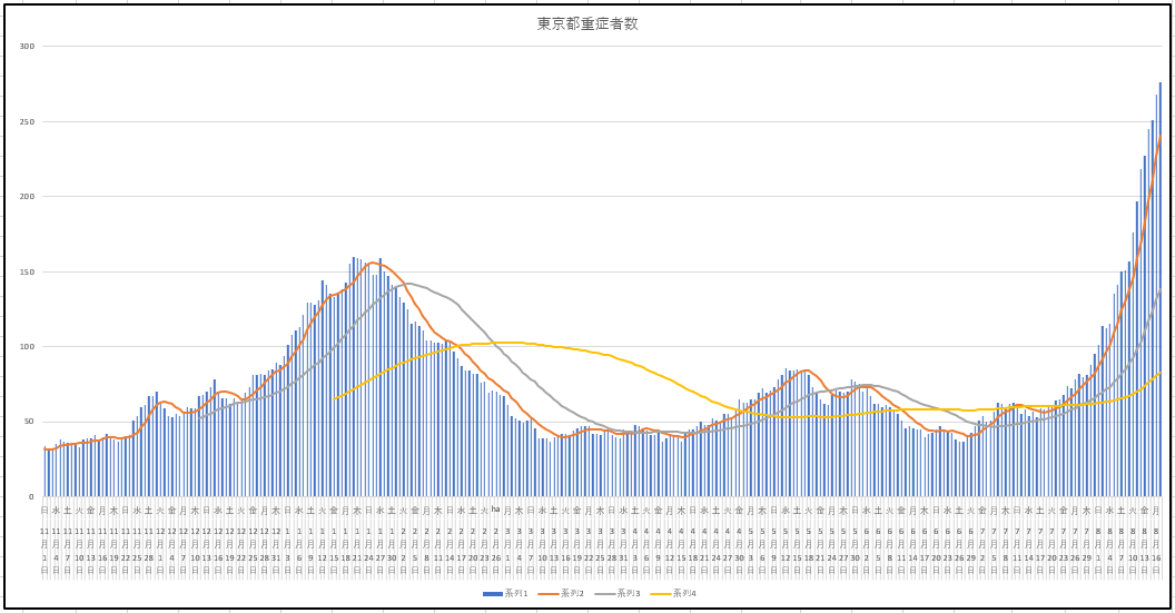 2021/08/17 - りす栗さんの株式ブログ。タイトル:「根っこのところをおさえるには??」 本文:東京都の新規感染、入院患者数、重症者数の推移グラフ。短期、中期、長期各移動平均線は引き続き上昇トレンド。対策をしていないわけではないのだが、どうも後手後手感は否めない。ずっと同じことを繰り返しているの